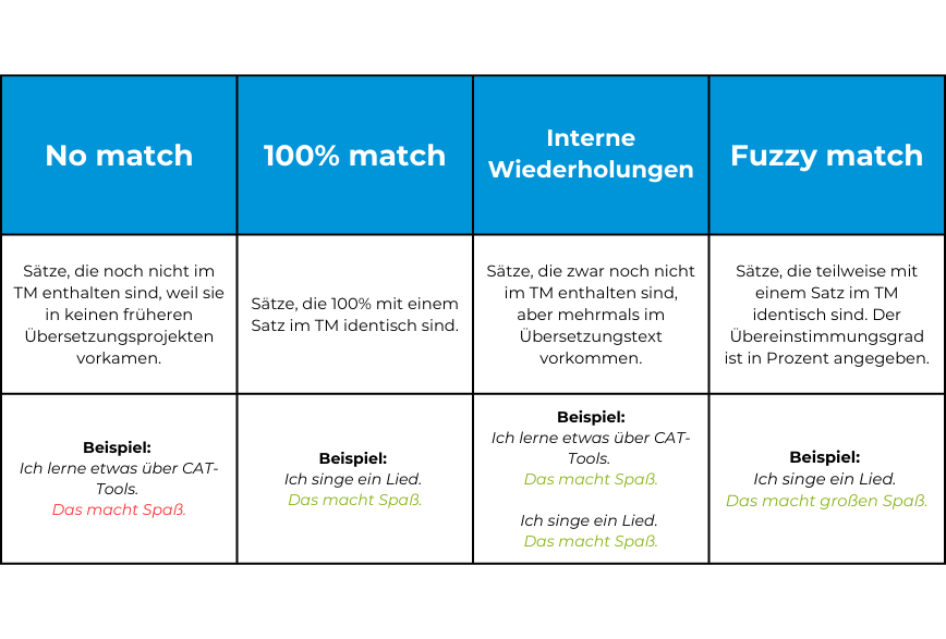 Bei der Übersetzung eines Textes unterteilt ein CAT-tool (Computer Aided Translation) den Ausgangstext in kleinere Segmente. Diese Segmente werden mit dem Inhalt des TMs verglichen. Wenn ein Segment bereits früher übersetzt und im TM gespeichert worden war, schlägt die Software dem Übersetzer vor, die vorherige Übersetzung wiederzuverwenden. Dies steigert die Effizienz.