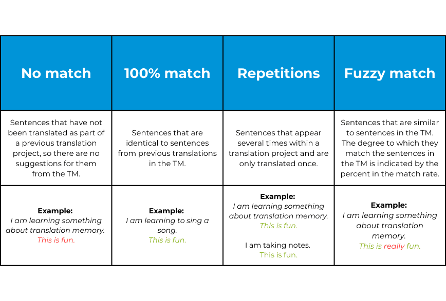 When your text needs to be translated, a Computer Aided Translation (CAT) tool will divide the text into smaller segments, which are then compared to the contents of the TM. If a segment has been translated before, the previous translation appears as a suggestion to the translator, which in turn increases the speed with which they can move through your text.